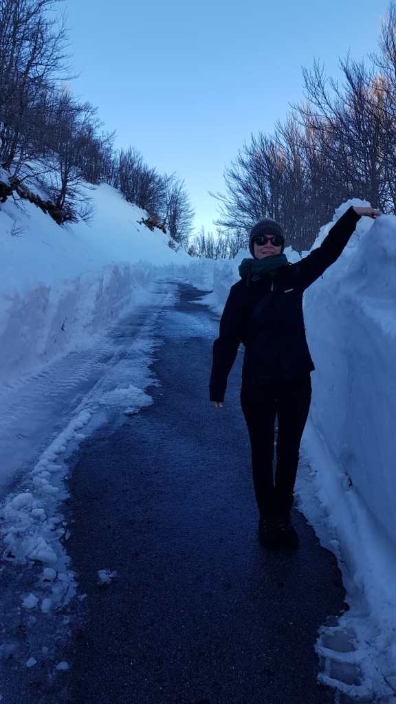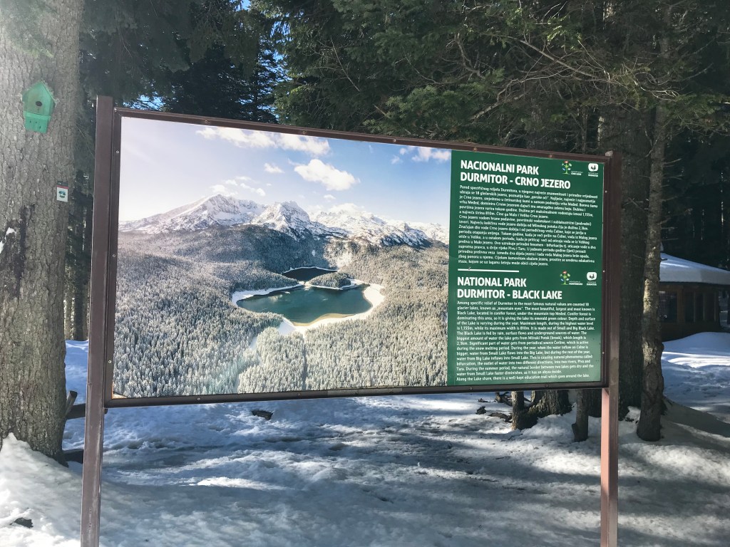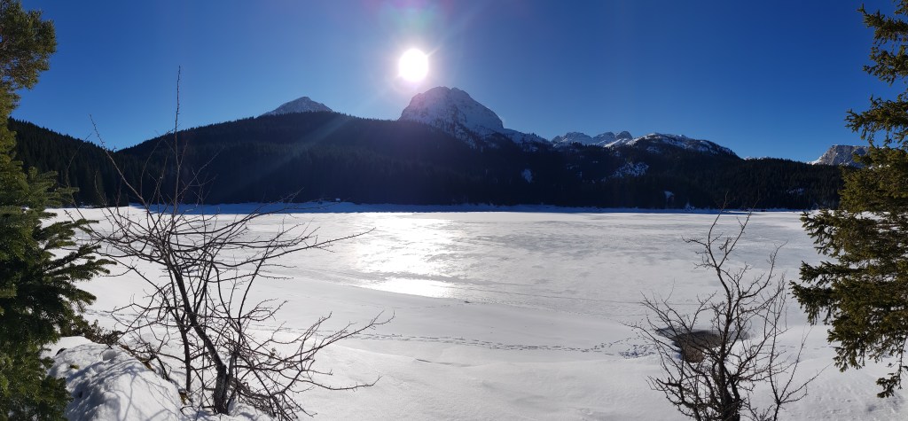 Nach dem Grenzübergang fuhren wir entlang von Stauseen und hohen Bergen ins Landesinnere von Montenegro. Die Infrastruktur ist wesentlich besser als in Bosnien & Herzegowina und die Häuser gepflegt, farbig und mit steilen Dreiecksdächern. Wir fuhren entlang der Panoramastrasse 1 mit dem Ziel Durmitor Nationalpark. Unsere ersten Eindrücke von Montenegro waren: unendliche Weiten, bergige Landschaft und viiiiiel Schnee. Gewisse vom Navi angezeigten Strassen waren aufgrund der Schneemengen inexistent. Als wir uns Zabljak und somit meterhohem Schnee näherten, beobachteten wir viele umgeknickte Verkehrsschilder, welche der Schneeräumung zum Opfer fielen. Zabljak ist ein bekannter Skiort in Montenegro und die Tür zum Durmitor Nationalpark sowie zum Skigebiet Savin Kuk. Das kleine Dorf beherbergt diverse Hotels, Läden, Restaurants und eine Touristinfo. Wir besuchten den Durmitor Nationalpark – oder besser gesagt den Bereich, der davon aktuell geöffnet war. Der im Sommer tiefblaue See war komplett zugefroren und mit Schnee überdeckt. Die Landschaft ähnelt sehr stark jener von Kanada bei Lake Louise. Grüne Wälder, hohe schneebedeckte Berge und Seen. Gemütlich unternahmen wir einen kleinen Spaziergang im Nationalpark – unsere Schneeschuhe blieben dieses Mal im Frosch.