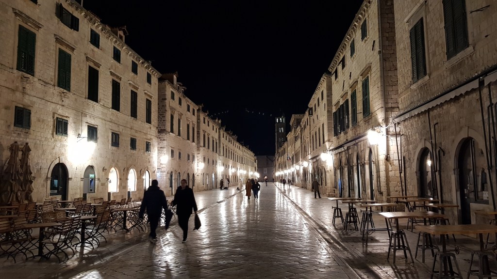 Die Grenzformalitäten waren schnell erledigt und bereits 30 Minuten später fuhren wir auf der Küstenstrasse mit steil abfallenden Klippen in Dubrovnik ein. Unser Stellplatz fanden wir an dieser Transitstrasse – praktisch zur Besichtigung von Dubrovnik und mit einem wundervollen Blick auf die Stadt und dessen Küste. Die Stadtlichter leuchteten im Dunkeln und wir machten uns auf den Weg in die Stadt. 549 Treppenstufen runter und später dann auch wieder hoch. Dubrovnik die Stadt der Treppen – unsere Fitness konnten wir mehr als unter Beweis stellen. Der Besuch von Dubrovnik im Februar hat den Vorteil von sehr wenig Touristen. Die Schönheit der Stadt und die eindrücklichen Gebäude kommen voll und ganz zur Geltung. Wir verbrachten einen gemütlichen Abend inklusive Nachtessen in der Stadt und freuten uns auf das Sightseeing am kommenden Tag.