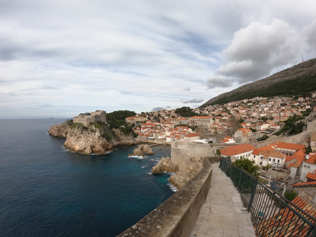 Sonnenschein lockte uns zur Stadtbesichtigung – der Rundgang auf den Stadtmauern stand als Erstes auf unserem Programm. Von den Stadtmauern aus genossen wir den Blick auf die Stadt, in die Gärten der Bewohner, auf die Küste und sogar auf unseren Frosch. Dieser war gut zu sehen hoch oben beim Stellplatz! Ein Kurzabstecher ins Maritime Museum und zur Festung Lovrjenac komplettierten unsere Stadtbesichtigung. Die Temperaturen stiegen und die Gelateria in der Stadt kam zum richtigen Zeitpunkt und wir so zu einem Gelato Mitte Februar. Die Stadt Dubrovnik, welche auf der Liste der UNESCO Weltkulturerbe geführt wird, ist wirklich eine Reise wert. Wer an der Adria entlang gegen Süden fährt, wird mit den Städtchen Zadar, Sibenik, Trogir oder Omir Stück für Stück an das Highlight am südlichen Ende von Kroatien hingeführt. Spannend zu erwähnen ist, dass die kroatische Küstenline kurz unterbrochen wird und das heutige Bosnien-Herzegowina einen Zugang zur Adria hält. Dies ist auf die Zeit des Osmanischen Reiches im 16. Jahrhundert zurückzuführen, da war Dubrovnik, damals als Republik Ragus, im Wettstreit mit der Stadt Venedig über die Handelsvormachtstellung im Mittelmeer. Um die Stadt zu schützen, wurden riesige Wehrmauern errichtet und dem osmanischen Reich einen Zugang zur Adria gewährt, welcher als Pufferzone gegen Venedig diente. Heute gehört dieser Teil der Küste zu Bosnien-Herzegowina und ist der Grund, dass Dubrovnik eine Exklave ist.