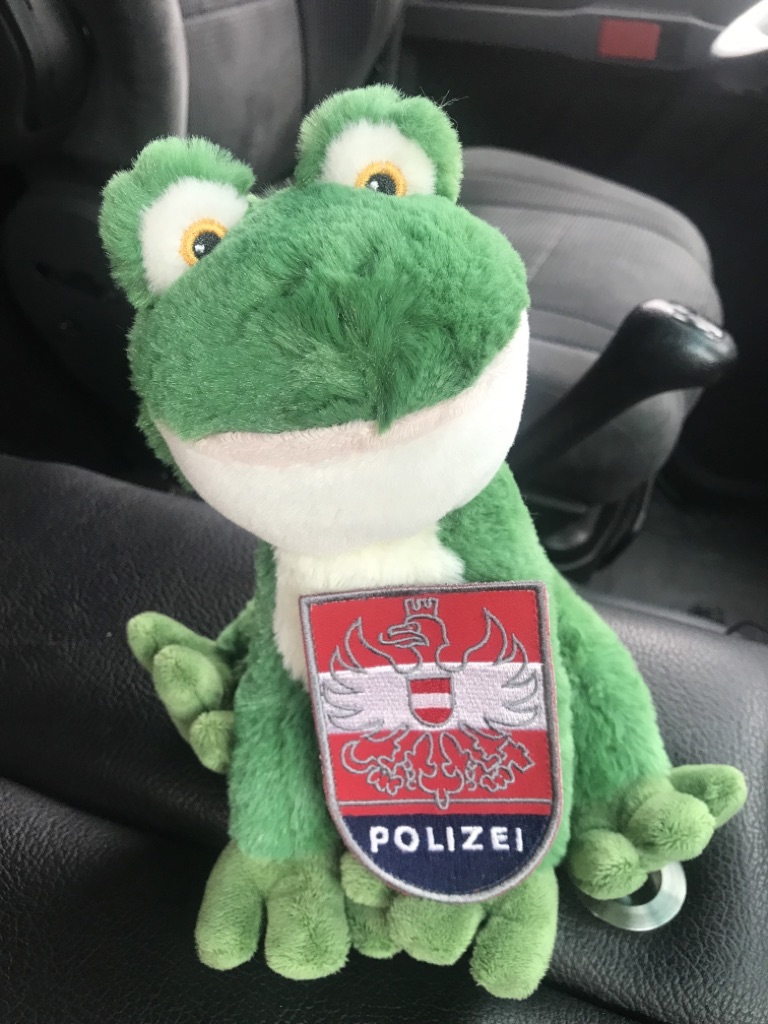 Gemächlich fuhren wir weiter Richtung Süden und sahen uns Sveti Stefan an – eine Luxusbadedestination in Montenegro. Die Insel mit dem exklusiven Hotel ist allerdings nur für Gäste zugänglich. Auf der Weiterfahrt Richtung Bar und Ulcinj hielten wir auf einer Nebenstrasse an, um unsere Route zu prüfen. Plötzlich stoppte ein dunkler SUV neben uns und vier Polizeibeamte stiegen aus. Der nette Herr fragte uns in breitem Österreicher Dialekt, ob er uns helfen könne. Wir schilderten ihm, dass wir aufgrund der Enge der Strasse nicht sicher seien, ob wir diese mit unserem Frosch befahren können. Nach kurzer Rücksprache mit seinen Kollegen aus Montenegro empfahlen sie uns eine Alternativroute. Bevor sie ihre Weiterfahrt in Angriff nahmen, stieg der österreichische Beamte nochmals aus und überbrachte uns ein Souvenir für unser Maskottchen. So trägt unser Fröschli nun ein Polizeiabzeichen von Österreich ;-).