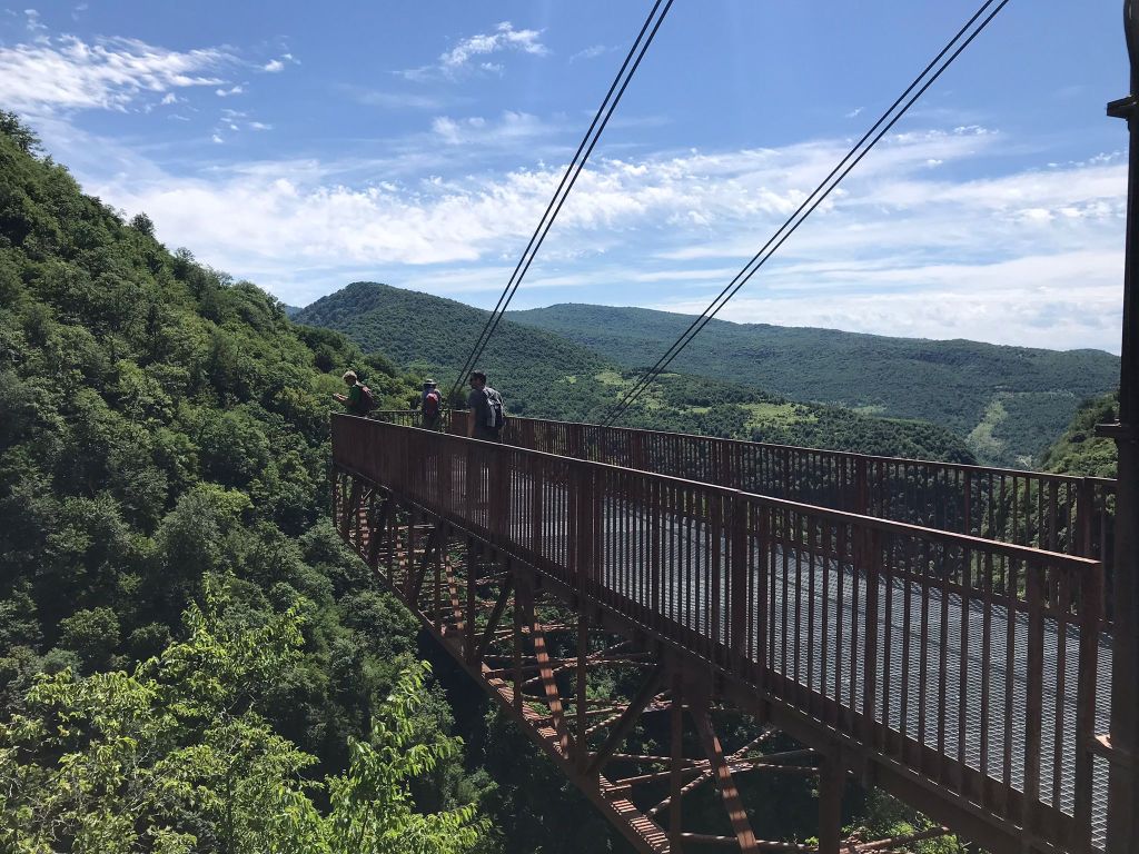 Als wir am Nachmittag beim Okatse Canyon ankamen, wurde uns im Visitor Center mitgeteilt, dass der Park aufgrund der Niederschläge der vergangenen Tage aktuell geschlossen sei. Bereits auf der Hinfahrt waren Teile der Strasse durch Erdrutsche versperrt gewesen. Nach einer Nacht auf dem Parkplatz des Visitor Centers (mit leider sehr viel Hundegebell und -geknurre) konnten wir die Schlucht besuchen. Nach einem rund 2km langen Fussweg erreichten wir die Schlucht. Ein hängender Steg führt zu einer grossen Aussichtsplattform – nichts für schwache Nerven oder Personen mit Höhen- oder Schwellenangst. Der Ausblick tief in die Schlucht sowie über die grünen Hügel Georgiens war wundervoll.