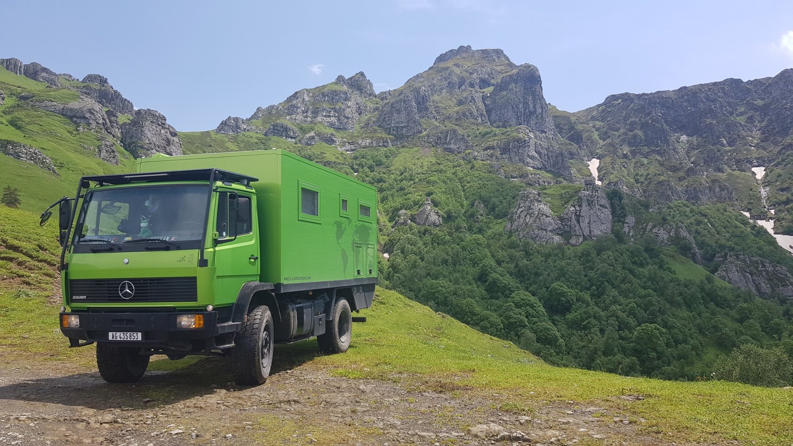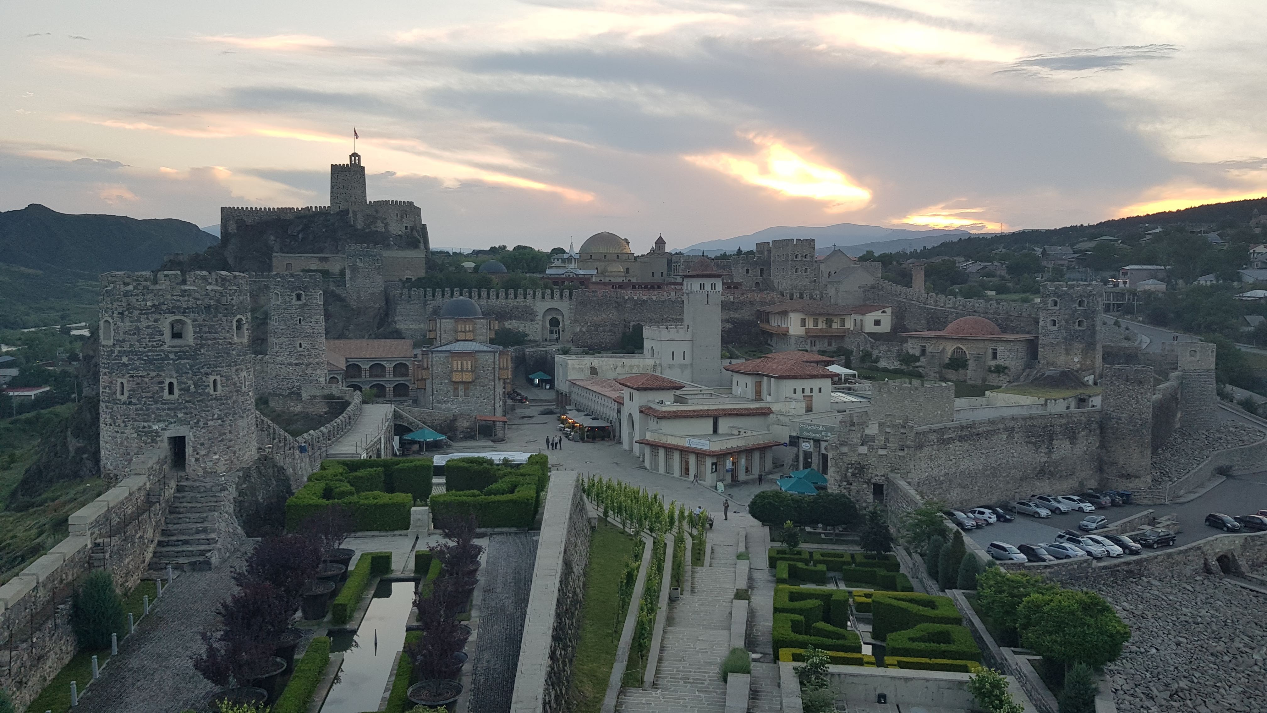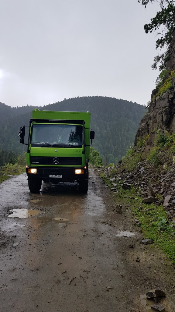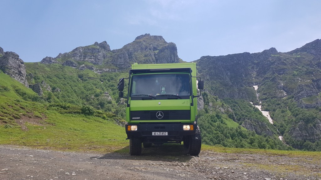 Wie bereits in den vergangenen Tagen war wiederum Regen angekündigt und so entschieden wir uns einen Arbeitstag auf einem grossen Truckstopp einzulegen bevor wir südwärts zum Rabati-Schloss fuhren. Nach knapp zwei Tagen Dauerregen erkundigten wir uns bei der lokalen Bevölkerung über den Zustand des Zekari-Passes. Nach mehreren positiven Rückmeldungen entschieden wir uns den Weg über den 2’100 Meter hohen Pass zu fahren. Bis zum Kurort Sairme, bekannt auch für das Mineralwasser, war die Strasse geteert und anschliessend nur noch mit Allradfahrzeugen befahrbar. Unser Frosch meisterte die Strecke ohne Probleme. Als wir auf auf der Passhöhe ankamen, erinnerte uns der Anblick an die Wanderwege auf dem Männlichen im Berner Oberland – mit dem Unterschied dass wir hier nicht zu Fuss unterwegs waren sondern mit unserem Expeditionsmobil. Aufgrund der Strassenverhältnisse dauerte die Strecke ziemlich lange bevor wir schliesslich in Achalziche ankamen. Nach einer Stärkung und Abwarten eines Gewitters klarte der Himmel auf und wir konnten dank der langen Öffnungszeiten des Schlosses die Besichtigung bei blauem Himmel und Sonnenuntergang unternehmen. Das Rabati-Schloss stammt aus dem Mittelalter, wurde allerdings vor rund 10 Jahren renoviert. Es gibt dort eine Kirche, eine Moschee sowie eine Synagoge.