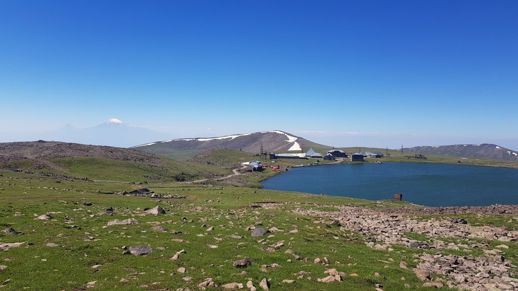 Unsere Reise führte uns noch am gleichen Tag an den Sewan-See. Dieser liegt auf 1’900 Meter über Meer und ist der grösste See im Kaukasus. Nach einer ruhigen Nacht bei angenehmen 20 Grad fuhren wir in den Ort Sewan um Einkäufe zu tätigen. Auf der Suche nach einem Einkaufsladen, fühlten wir uns in die Sowjetzeit zurück versetzt, als wir durch die Wohnquartiere mit den grossen Wohnblöcken fuhren. Die Läden in Armenien sind meist so foliert, dass man nicht hineinsehen kann und wirken daher ziemlich unscheinbar. Als wir in den Laden eintraten, kam eine freundliche Verkäuferin auf uns zu und unterstützte uns beim Einkauf. Wir beobachteten, dass auch andere Kunden beim Einkauf begleitet wurden – etwas Neues für uns. Während rund einer Stunde versuchten wir anschliessend Geld zu wechseln. Die erste Bank teilte uns mit, dass sie keine Schweizer Franken wechselten und in der zweiten Bank hat Manuela nach 30 Minuten Wartezeit das Vorhaben „Geldwechsel“ abgebrochen. So entschieden wir uns an einem Geldautomaten, mit entsprechenden Gebühren, Armenische Dram zu beziehen. Auch in Armenien gilt in vielen Situationen: No card, only cash. Wir legten einen weiteren Tag am Sewan-See ein – so gut gefiel uns die Gegend und insbesondere die kühlen Temperaturen. Stefan nutzte die Gelegenheit für einen Arbeitstag und Manuela widmete sich der Handwäsche. Am Folgetag besuchten wir in der Nähe von Jeghward den ausgewanderten Schweizer und seine Familie und wurden zu einem köstlichen Mittagessen eingeladen und erhielten weitere Tipps für Armenien sowie einen Einblick in ihr Heim und Leben. Gegen Abend zog es uns weiter Richtung höchsten Berg Armeniens – den Aragaz. Am Fusse des Berges hatten wir einen tollen Stellplatz mit Sicht auf den höchsten Berg der Türkei – den Ararat – und seinem schneebedeckten Gipfel.