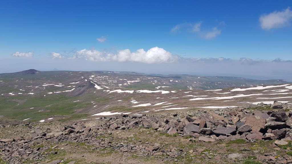 Am Folgetag fuhren wir mit dem Frosch auf 3’200 Meter über Meer um von dort die Wanderung zum Südgipfel des Aragaz zu unternehmen. Der Aragaz ist ein erloschener Vulkan, dessen höchster Punkt auf 4’090 Meter über Meer liegt. Die Fahrt und die Überwindung der Höhenmeter war für unseren Superfrosch gar kein Problem. Unsere anschliessende Wanderung zum Südgipfel auf 3’895 Meter über Meer meisterten auch wir mit Bravour – wobei die Höhenluft Manuela zunehmend zusetzte und wir vorsorglich nicht den Übernachtungsplatz auf 3’200 Meter ansteuerten, sondern wieder auf knapp 2’000 Meter über Meer hinabfuhren.
