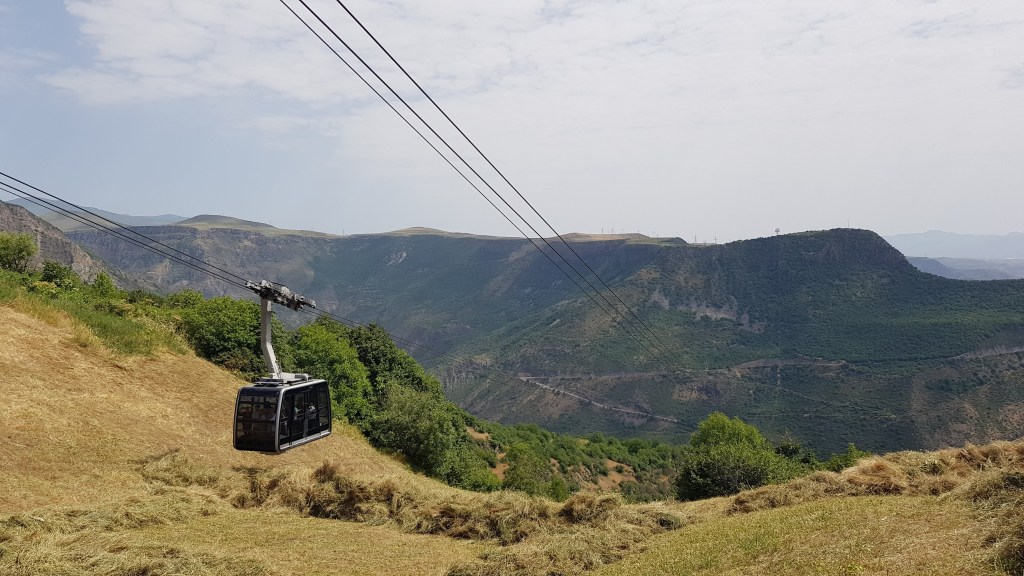 Unser Weg führte danach via Sisian, wo wir nebst der Besichtigung des Wasserfalls auch noch einige Besorgungen für die letzten Tage in Armenien machten, weiter nach Tatev, dem letzten Sightseeing Ort auf unserer Armenien Liste. Die Fahrt dorthin ist spektakulär, denn es gilt die Worotan-Schlucht zu überwinden. Die Strasse – notabene die offizielle LKW-Route von Armenien nach Iran – führt zunächst 1’500 Meter in die Tiefe und anschliessend mit 15% Steigung wieder in vielen Serpentinen den Berg hinauf. Wer sich diese Fahrt sparen will und nicht auf dem Weg von Armenien in den Iran ist, kann die 2.7 Kilometer breite Schlucht mit der Gondelbahn – der Wings of Tatev – überwinden. Diese Seilbahn hält den Weltrekord als längste Pendelbahn (5750 Meter lang), die in einem Stück mit einem durchgehenden Seil operiert und wurde von Doppelmayr/Garaventa im Jahre 2010 erbaut. Wir durften zwei Tage auf dem Parkplatz der Seilbahn beim Tatev-Kloster stehen und konnten entsprechend das Kloster frühmorgens besuchen. Das im 9. Jahrhundert erbaute Kloster ist eines der bedeutendsten Architekturdenkmäler von Armenien und war im Mittelalter sowohl religiöses als auch universitäres Zentrum. Ein Erdbeben im Jahre 1931 zerstörte einen grossen Teil der Anlage, die seither nur teilweise wieder in Stand gesetzt wurde. Während unserer Tage in Tatev widmete sich Stefan wiederum der Arbeit und wir tätigten weitere Vorbereitungen für die Einreise in den Iran – so entfernten wir beispielsweise unsere Homepagebeschriftung am Frosch und speicherten die wichtigsten Sätze auf Farsi in unserem Handy. Am zweiten Tag stiessen deutsche Reisende zu uns und wir beschlossen, gemeinsam den Grenzübertritt in den nächsten Tagen zu absolvieren.
