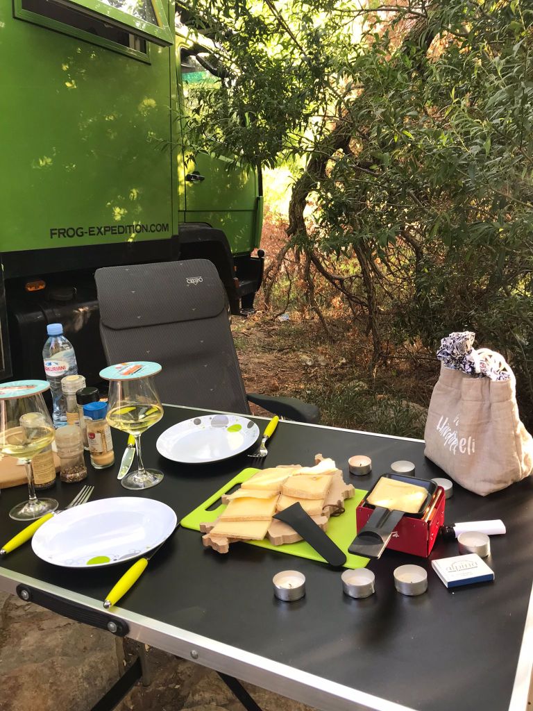 Wir wurden schliesslich in einer Schlucht fündig und parkierten unseren Frosch für zwei Tage an einem schattigen Plätzchen direkt an einem Bach. Dort genossen wir auch unser Raclette mit Schweizer Käse, dem wir – gegen teures Geld – im Käseladen in Yerevan nicht widerstehen konnten. Die über 30 Grad Umgebungstemperatur spielten dabei keine Rolle. Wiederum nutzten wir den Stellplatz für diverse Arbeiten und genossen ab und zu eine Abkühlung im Wasser des Bachs.