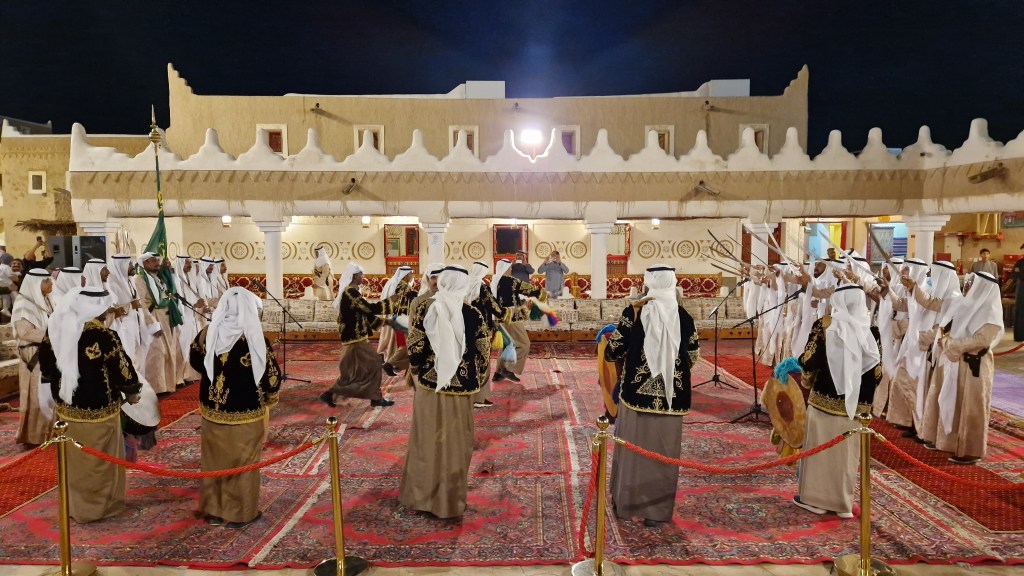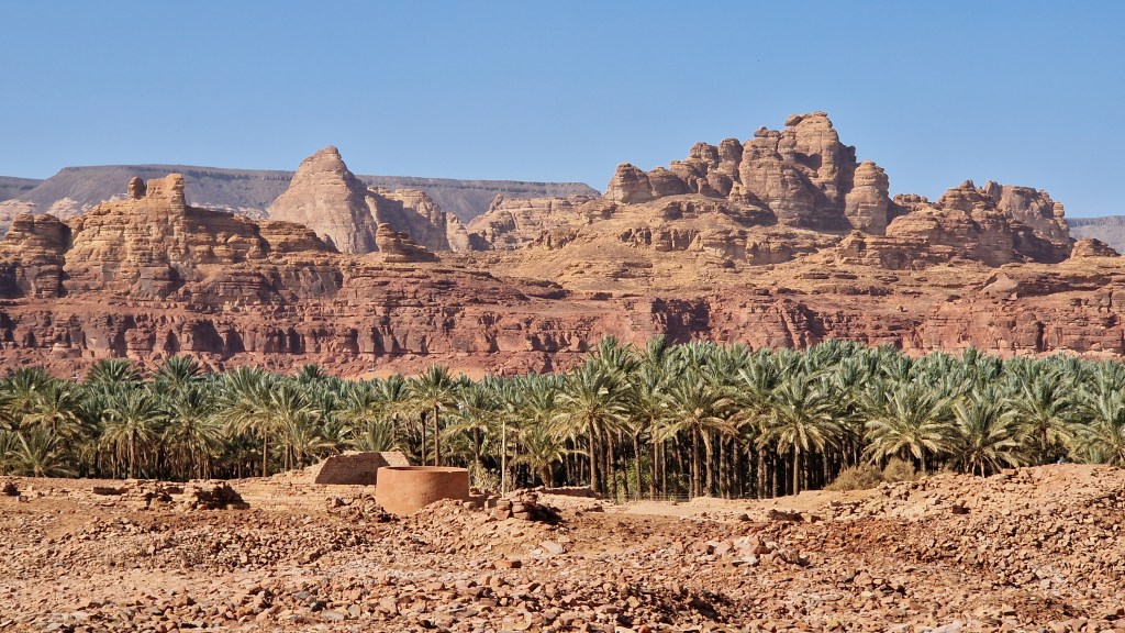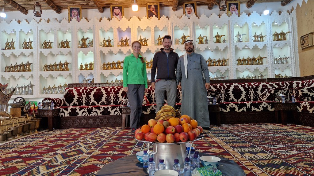 Buraida war unser nächstes Ziel, eine Stadt nördlich von Riad. Auf dem Weg dorthin wurden wir Zeugen, wie sich die Einheimischen nach Regenfällen amüsierten. An den Ufern der sich gebildeten Seen fanden sich die Leute zum Picknick und Beisammen sein ein. Zunächst glaubten wir, es fände ein Festival oder Ähnliches statt, aber die Leute frönten nur dem Picknick am Ufer des Wassers, an dem sich auch diverse Foodtrucks einfanden. Unser Ziel war der Al Musawkaf Markt. Dieser Markt befindet sich in einem offenen Hof, mit Wasserstelle und Palmen und in rund 50 Läden wurden verschiedene Waren verkauft. Als wir eintrafen, kamen wir rasch ins Gespräch mit Einheimischen, die uns mitteilten, dass die Ankunft eines Prinzen heute Abend hier erwartet würde. Aus diesem Grund fanden auch Tanz- sowie Gesangsaufführungen statt. Wir liessen das Treiben und die Klänge auf uns wirken, verliessen aber nach einigen Stunden den Markt – der Prinz hatte sich bis dahin noch nicht blicken lassen.