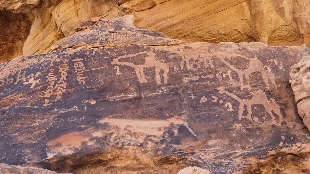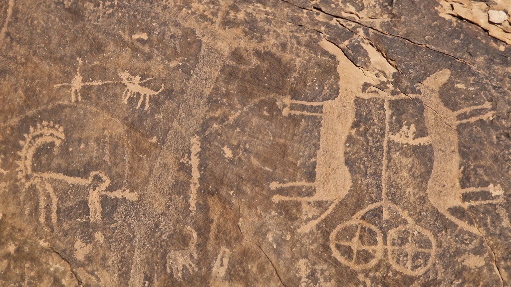 Wir fuhren anschliessend weiter Richtung Norden in die Stadt Ha’il – respektive dessen Umgebung. Ha’il befindet sich am südlichen Rand der Nefud Wüste und gilt als beliebter Ort auf der Pilgerreise von Bagdad nach Mekka. Auch internationale Events finden in dieser Region statt, bspw. eine Wüstenralley. In Ha’il selbst gab es nicht so viele Sehenswürdigkeiten, aber ein wenig nördlich der Stadt lag Jubbah. In diesem kleinen Ort, der komplett von Wüste umgeben ist, befinden sich wichtige Felsmalereien, die als UNESCO Welterbestätte gelistet sind. Nach einer ruhigen Nacht auf dem Parkplatz beim Visitor Center erkundeten wir zwischen asiatischen Reisegruppen die Stätte. Die vielen Petroglyphen zeigen die Entwicklung und Ansiedlung der Menschen. So waren auf den frühesten Abbildungen einfach Tiere wie bspw. ein Steinbock zu sehen und bei späteren Steinmalereien ein Pferd welches einen Wagen zog. Die Veränderung der Lebensweise der Menschen und die Wichtigkeit der Tiere ist sehr gut anhand der Felsmalereien erkennbar.