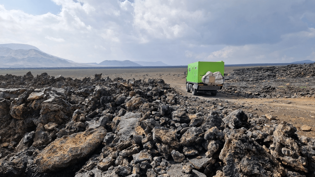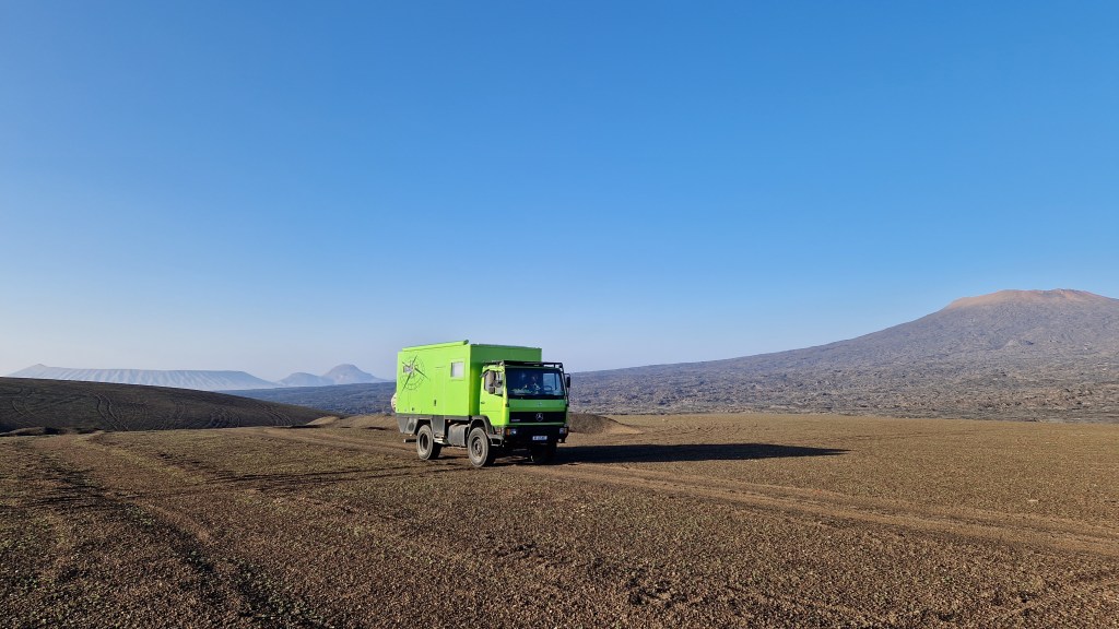 Als wir wieder beim Frosch ankamen, nahmen wir die Strecke in Richtung Weisser Vulkan unter die Räder. Die Route führte zunächst auf Sand entlang des schwarzen Lavafeldes. Anschliessend musste das Lavafeld durchquert werden, wobei wir die scharfen Lavasteine, die sich unseren Reifen in den Weg stellten, gut im Auge behalten mussten. Die Route wurde immer schroffer aber der Anblick des Weissen Vulkans entschädigte für die Mühen der Anfahrt. Wir verbrachten eine ruhige und kühle Nacht beim Lavafeld bevor wir am Folgetag aus der Lavagegend hinaus weiter nordwärts fuhren.