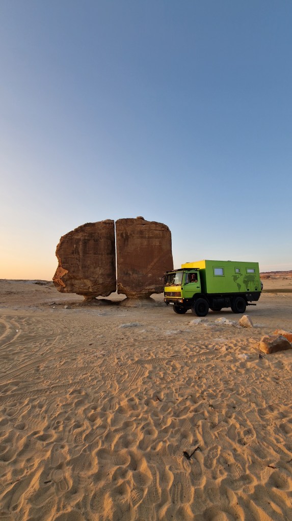 Der gespaltene Steinfelsen – Al Naslaa Rock – liegt etwa 10 Kilometer von der Hauptstrasse entfernt. Die Strecke dorthin führt durch Softsand der manchmal durch felsige Plateaus unterbrochen wird. Nach dem Ablassen des Luftdrucks aus unseren Reifen waren wir bereit für die Strecke. Schaukelnd ging es durch die Wüste – die Orientierung fand mit der Satellitenkarte statt. Wir erreichten den Felsen am Abend und hatten das Glück, alleine vor Ort zu sein. In etwa 10 Minuten Gehdistanz befand sich der Baby Elephant Rock. Wir durften eine ruhige Nacht unter Sternenhimmel an diesem magischen Ort verbringen.