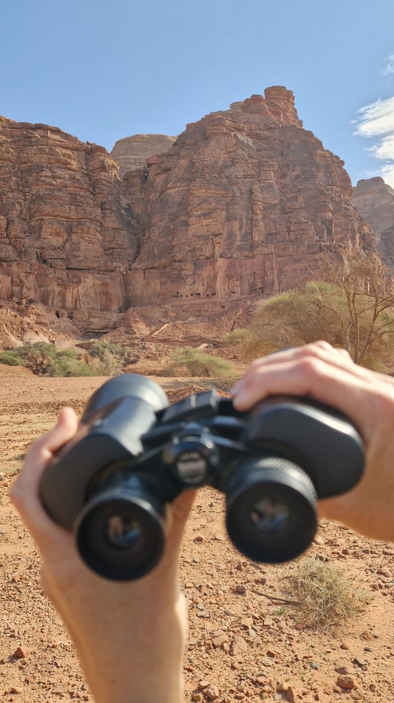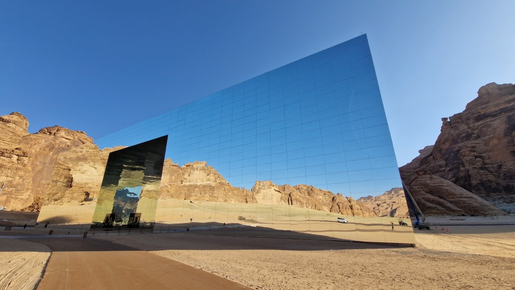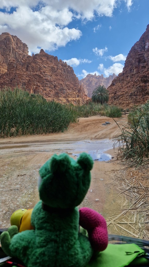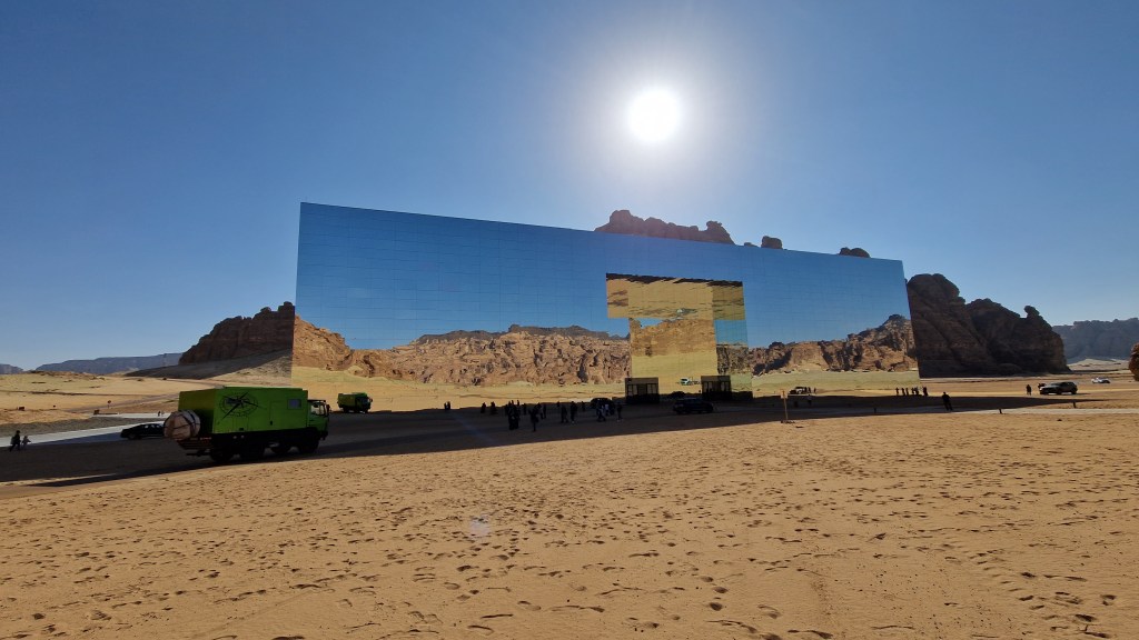 Die Gegend um Al Ula gehört zu den am meisten touristisch entwickelten Regionen in Saudi Arabien. Sie ist reich an Geschichte, da die Stadt Al Ula eine der ältesten Städte auf der arabischen Halbinsel ist. Die Stadt lag an wichtigen Handelsrouten und sie war die Hauptstadt der Lihyaniten (Dedaniten). Zu den verschiedenen Attraktionen gehören: Eine riesige Felsformation in Form eines Elefanten, die Felsengräber und antiken Stätten der Nabatäer, das grösste Spiegelgebäude der Welt etc. Als wir in Al Ula einfuhren, fielen uns sofort die vielen Sicherheits- und Polizeipatrouillen auf sowie die Hinweisschilder, dass es bei Littering eine Busse gibt (solche Schilder hatten wir bisher noch nie in Saudi Arabien gesehen). Von anderen Reisenden hatten wir erfahren, dass die Zufahrt zum grössten Spiegelgebäude der Welt eingeschränkt ist und man nicht ohne weiteres dorthin fahren kann. Das grösste Spiegelgebäude ist ein Konzertsaal mit einem Restaurant auf der Dachterrasse. Wir reservierten einen Tisch im Restaurant und die Zufahrt zu Maraya – dem Spiegelgebäude war kein Problem mehr. Das Spiegelgebäude fügt sich perfekt in seine Umgebung ein und wir mussten teilweise zweimal schauen ob wir nun das Spiegelgebäude betrachteten oder die richtigen Berge. Am Abend zuvor gab Andrea Bocelli ein Konzert in dieser Halle und wir erfuhren von einer Angestellten, dass dieses sehr gut besucht war. Weiter erzählte sie uns, dass die Saison in diesem Gebäude ziemlich kurz ist, denn im Sommer werde es aufgrund der Spiegel so heiss im Gebäude, dass keine Konzerte stattfinden können und auch das Restaurant nicht in Betrieb ist. Über 1000 Arbeiter errichteten das Gebäude in weniger als drei Monaten. Natürlich brauchten wir ein Foto mit dem Frosch vor Maraya!