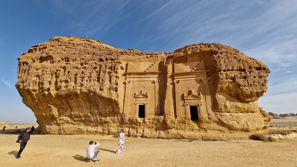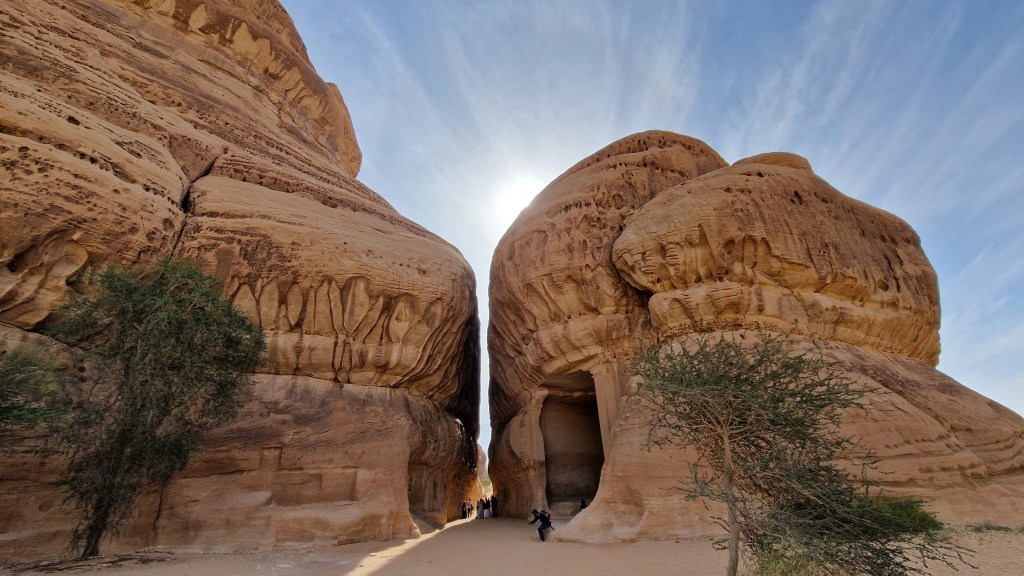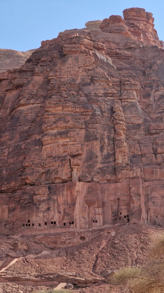 Am nächsten Tag hatten wir eine Tour zur Stätte Hegra – Mada’in Salih gebucht. Touristenbusse brachten uns vom Parking zur etwa 30 Minuten entfernten Stätte. Dort können die diversen Felsengräber wie auch Canyons mit grossen Höhlen, die früher als Treffpunkte genutzt wurden, bestaunt werden. Seit 2008 ist diese Stätte UNESCO geschützt – als Erste in Saudi Arabien. Das Erstaunliche daran war, dass diese Stätte den Einwohnern zwar bekannt war aber die Ausgrabungen und der Schutz und die Erforschung dieser Stätten erst wenige Jahre zurück liegt. Eine Führerin hatte uns erzählt, dass sie früher jeweils mit ihren Familien zum gemeinsamen Picknick zu diesen Gräbern gefahren seien, so als sei es das Normalste der Welt.