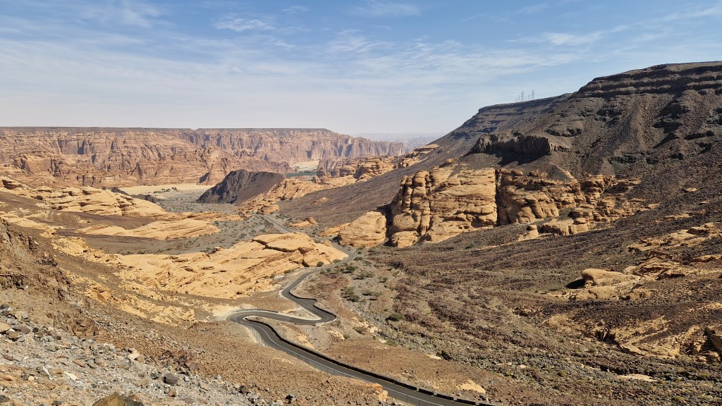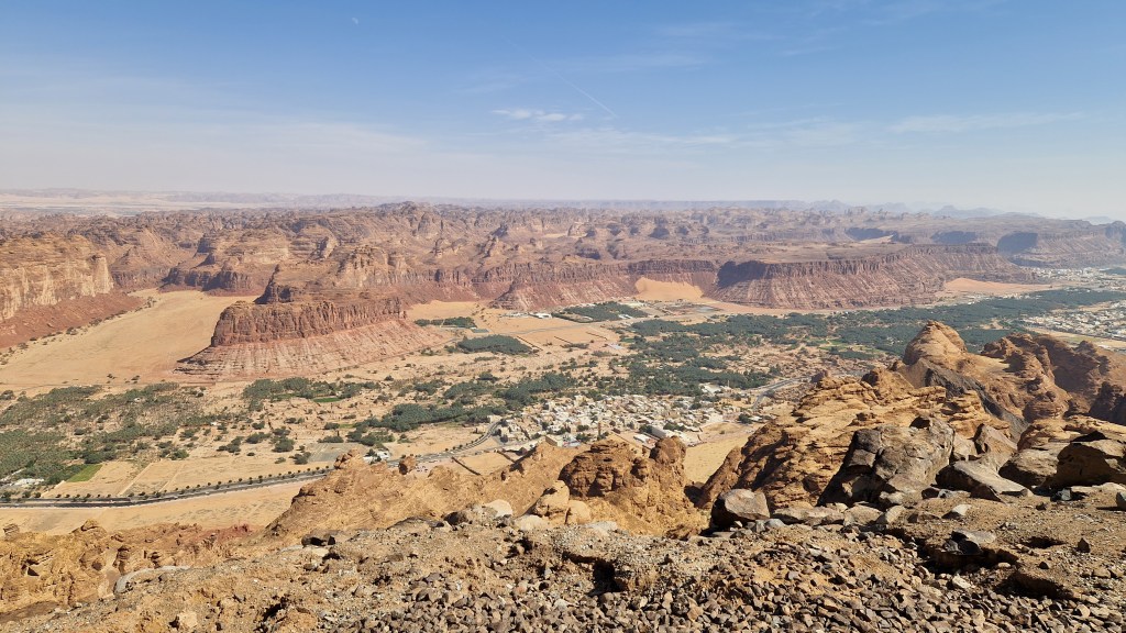 Nach der rund vier stündigen Tour durch Hegra fuhren wir zum Harrat Viewpoint, von dem aus wir einen fantastischen Blick über die Oasenstadt Al Ula hatten. Die Strasse führte steil bergauf, auf über 1000 Meter über Meer und zu einem Restaurant. Wir genossen den Ausblick und einen Snack bevor wir uns wieder ins Tal begaben.