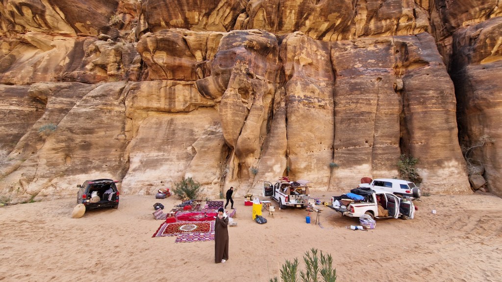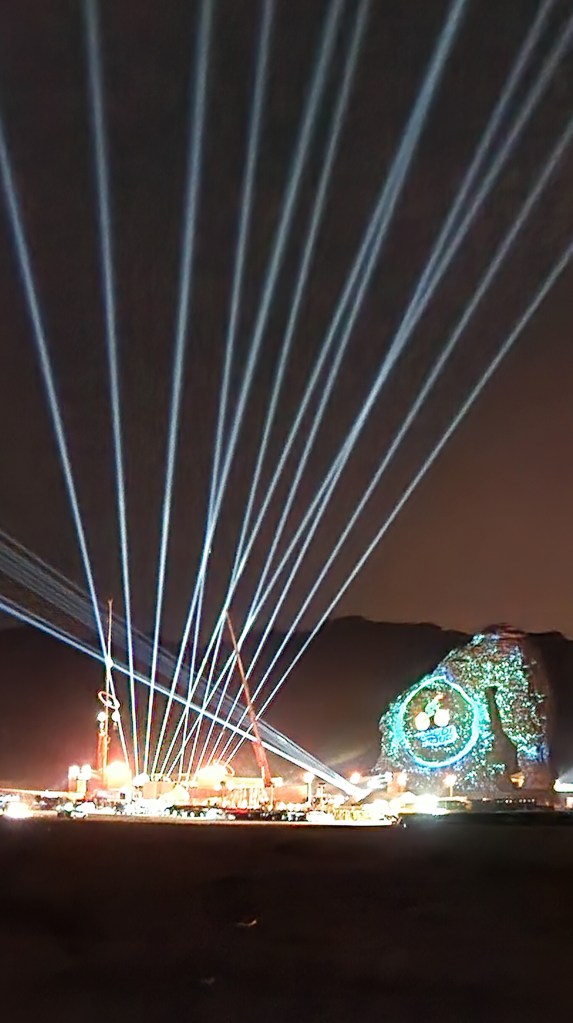 Der Elephant Rock ist eine sehr bekannte Felsformation in Al Ula. Als wir dort ankamen, mussten wir feststellen, dass die Stätte aufgrund der exklusiven Nutzung durch die Saudi Tour geschlossen war. Die Saudi Tour ist ein internationales Radrennen, das am Folgetag in Al Ula startete. Glücklicherweise war die dahinterliegende Wüstengegend nicht abgesperrt, wodurch wir einen Schlafplatz sowie auch einen Platz in der zweiten Reihe für die Licht – und Drohnenshow der Eröffnungszeremonie beim Elephant Rock bekamen.