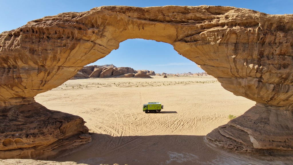 Nach der Durchquerung der Hisma Wüste von Süden nach Norden wollten wir zu einem weiteren Felsbogen fahren. Wir überquerten die Strasse 394 und erwarteten wiederum eine Zufahrt auf Sand. Zu unserem Erstaunen führte eine geteerte Strasse bis nahezu zum Felsbogen. Nach diesen Passagen waren wir schon ein eingespieltes Team beim Verringern bzw. Erhöhen des Reifendrucks. Der Felsbogen bot ein tolles Fotomotiv – fast wie ein Bilderrahmen mit Hintergrund für unseren Frosch.