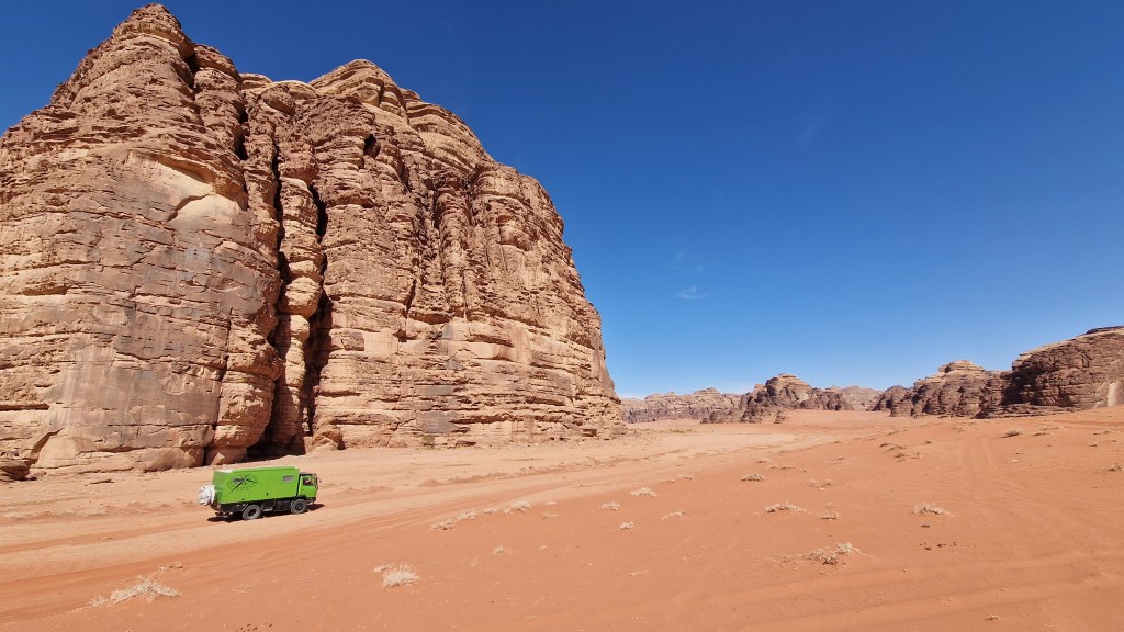 Von den österreichischen Reisenden haben wir den Tipp der Hisma Wüste erhalten. Wir bereiteten unseren Frosch auf die Fahrt im Softsand vor indem wir den Reifendruck auf rund 1.5 bis 2 Bar reduzierten. So schaukelten wir wie auf einem Schiff über den Sand der Hisma Wüste und erkundeten die Gegend. Nach einem kleinen Felsbogen, machten wir uns auf den Weg zum Secret Garden. Durch einen schmalen Canyon gelangten wir in einen grösseren Bereich, der bei Kletterern sehr beliebt ist. Als wir weitergingen, wurde schliesslich der Canyon so eng, dass selbst wir nur noch seitwärts vorankamen. Wir fanden uns in einer einmaligen Landschaft wieder, die noch unberührt war und in der es hinter jeder Ecke etwas zu entdecken gab.