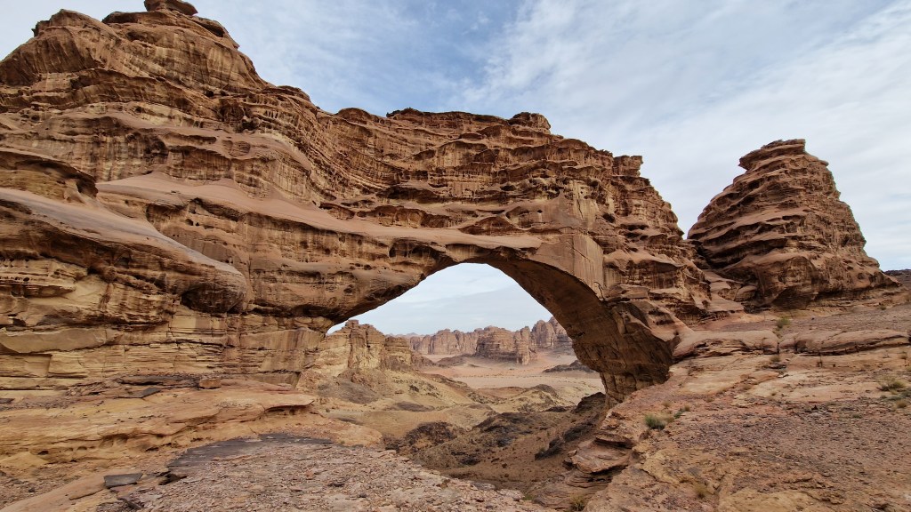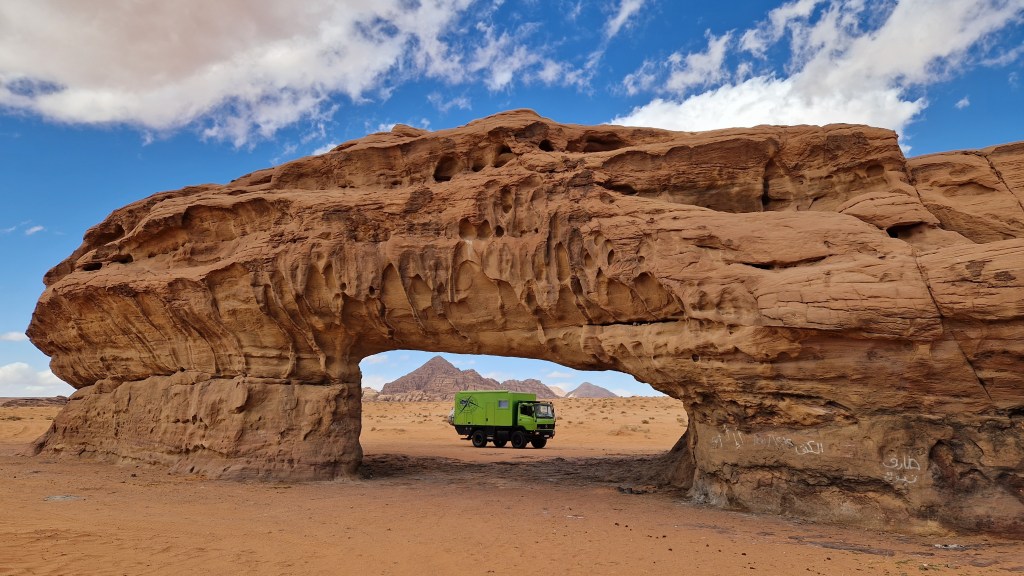 Nach der zweiten Übernachtung in der Hisma Wüste kamen wir in eine eher steinige Gegend und fanden einen riesigen Felsbogen. Zu unserem Erstaunen waren immer wieder Steine mit Farbe markiert, die einem den Weg hinauf zum Felsbogen leiteten.