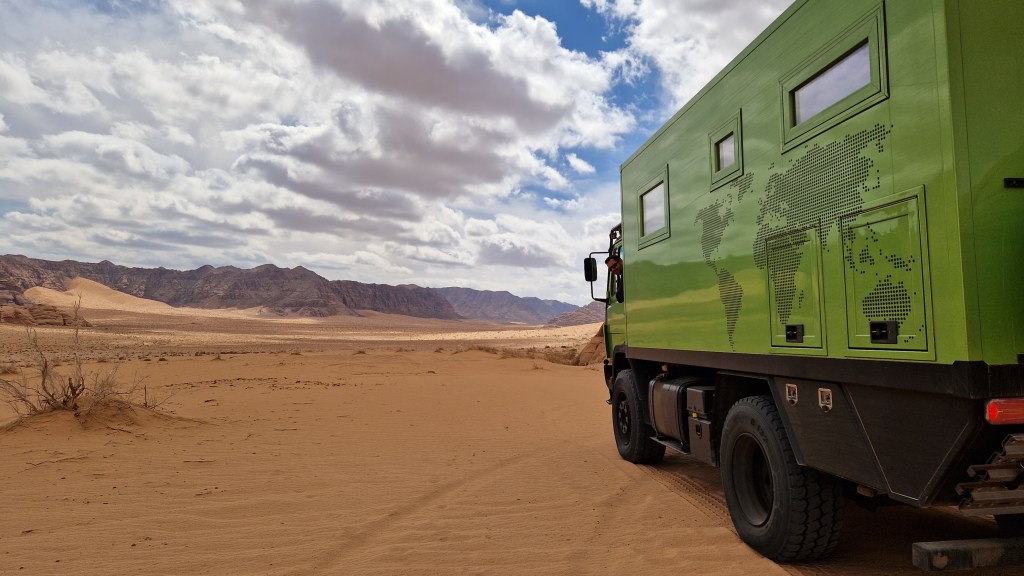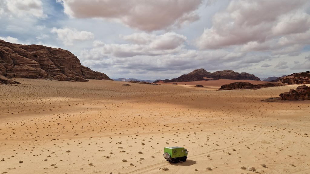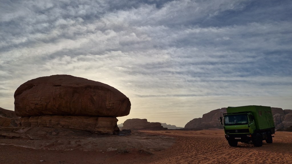 Rund eine Stunde nördlich der Stadt Akaba liegt das UNESCO Welterbe Wadi Rum, Jordaniens bekannte und wundervolle Wüste, die natürlich auf unserem Reiseplan stand. Bereits am Eingang zeigte sich, dass die touristische Entwicklung in diesem Land fortgeschritten war. Entgegen zur Hisma Wüste in Saudi Arabien, wurden hier Jeep Touren und Transfers zu den Unterkünften in der Wüste angeboten, damit alle Touristen sich das Naturhighlight anschauen konnten. Für uns war der rege Fahrzeugverkehr in der Wüste zunächst gewöhnungsbedürftig, fanden wir noch wenige Wochen zuvor eine landschaftlich ähnliche Gegend vor, die aber über keine touristische Infrastruktur verfügte – noch nicht.