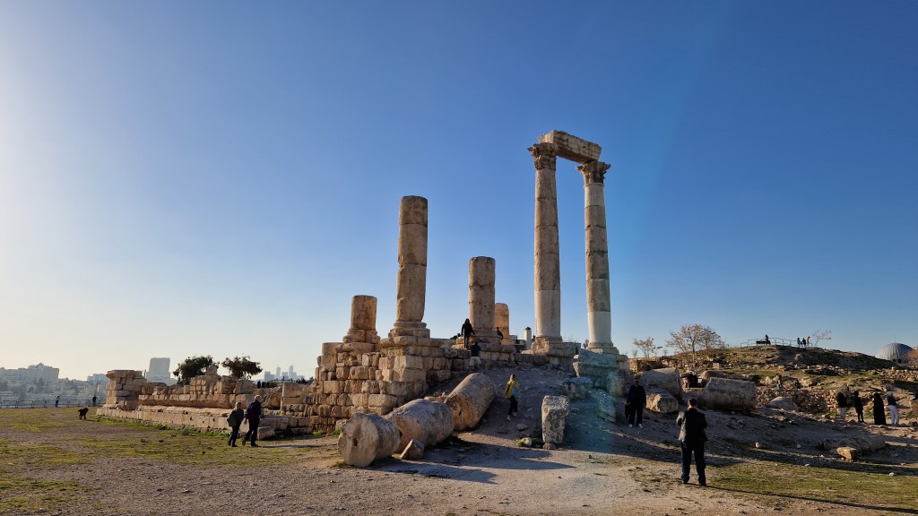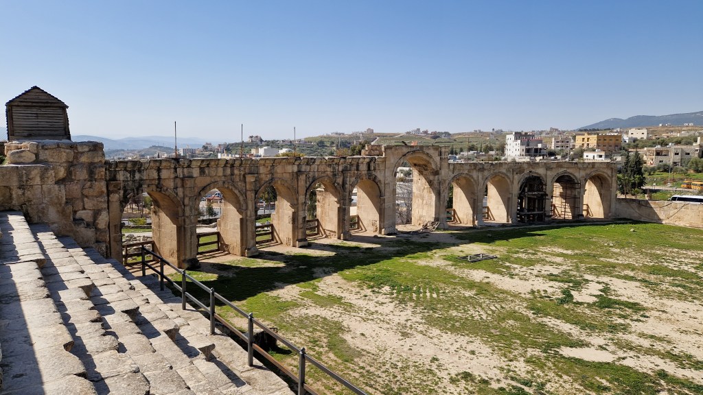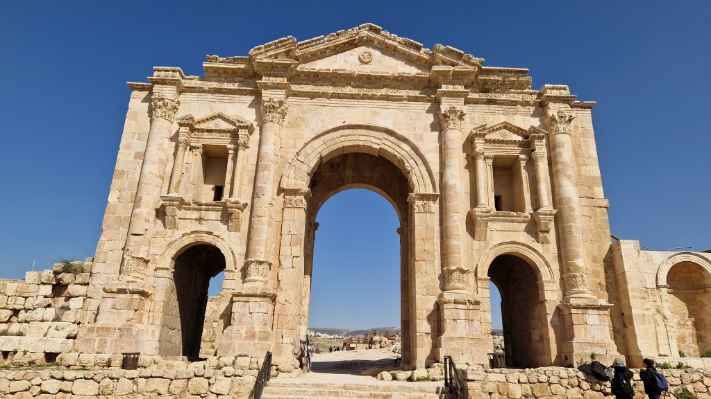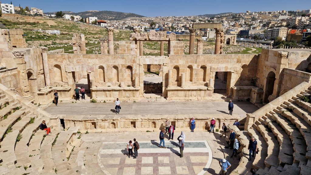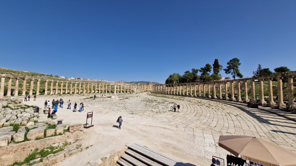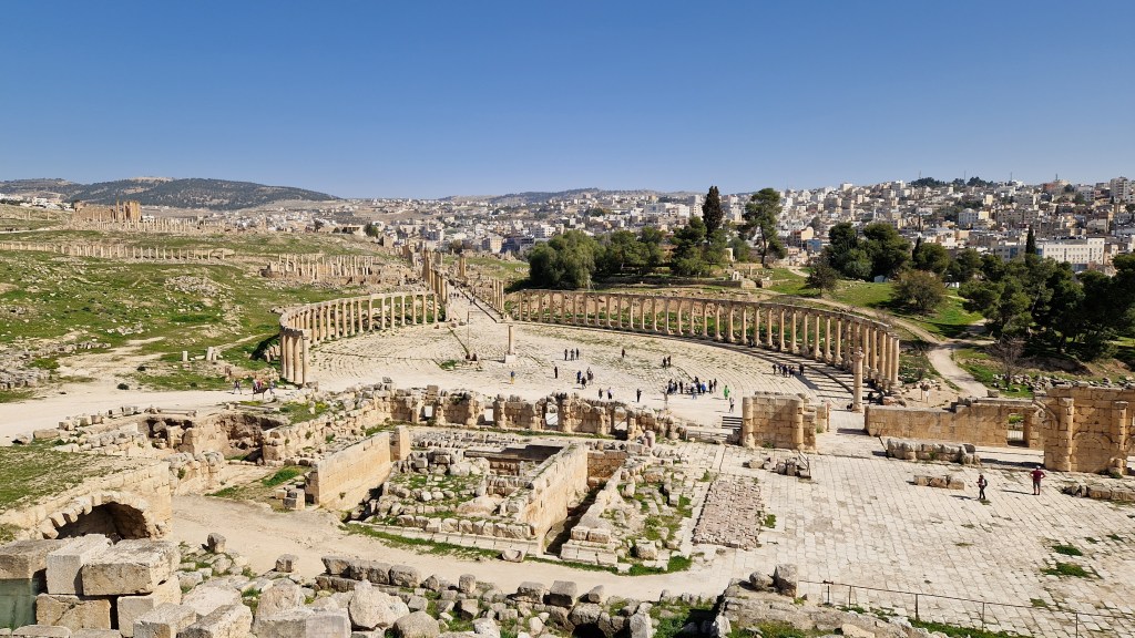 Nach einem Tag in der Hauptstadt zog es uns weiter nach Gerasa, einem Ort der rund 40 Kilometer nördlich von Amman liegt und auch unter dem Namen Pompeji des Ostens bekannt ist, da in Gerasa sehr gut erhaltene römische Ruinen vorhanden sind. Die bekanntesten Bauten sind der Hadriansbogen sowie das ovale Forum, das von Säulen umgeben ist. Weiter gibt es verschiedene Theater, Tempelbauten, Säulenstrassen etc. auf dem Gelände. Im Museum erhielten wir Erläuterungen zu einer der ältesten Maschinen der Welt – einer wasserbetriebenen Sägemühle. Diese wurde im 6. Jahrhundert in Gerasa entwickelt und zum Bau dieser Stadt eingesetzt.