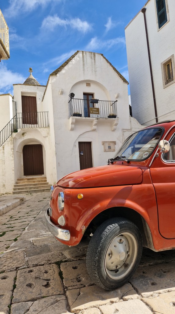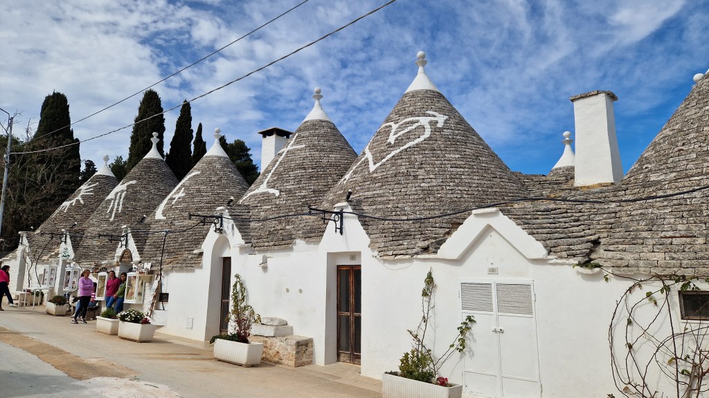 Anschliessend fuhren wir unser nächstes Reiseziel Alberobello an. Dort wollten wir die Hauptattraktion – die Trulli – UNESCO Welterbe seit 1996 – anschauen. Die Trulli sind kleine Rundhäuser, die meist weiss gestrichen sind und deren Dach aus aufgeschichteten Steinen besteht. In der Region sieht man diese Rundhäuser oft – in Alberobello gibt es ganze Stadtteile, die aus den Trulli bestehen und als Wohnhaus, Gasthaus, Laden oder Hotel genutzt werden.