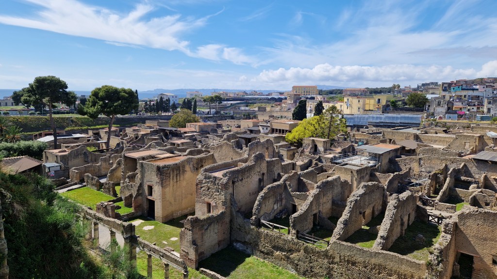 Unser nächstes Ziel war Pompei an der Westküste von Italien. Auf dem Weg dorthin durften wir eine Nacht bei einer Kollegin auf dem Privatanwesen stehen und die authentische italienische Gastfreundschaft inkl. seiner kulinarischen Aspekte und die gemütliche Gesellschaft geniessen. Am Folgetag erreichten wir um die Mittagszeit Pompei und steuerten direkt einen Camping in der Nähe des Eingangs zur archäologischen Stätte an. Wir gewöhnten uns langsam an die neue Art zu reisen – mit Übernachtungen auf Campingplätzen – denn wildcampen ist in Italien offiziell verboten. Schönes Frühlingswetter herrschte und wir machten uns mit den Velos auf nach Ercolano. Ercolano ist die Stadt westlich des Vesuvs, die ebenfalls im Jahre 79 n. Chr. vom Vulkanausbruch zerstört wurde und auch zum UNESCO Welterbe zählt. Als wir den Campingplatz verliessen, strömten Menschenmassen durch die Strassen. Die Nachosterwoche trug sicherlich zur höheren Besucherzahl bei, weshalb leider ein Besuch des Kraters des Vesuvs nicht möglich war, da alle Tickets bis in der kommenden Woche ausverkauft waren.