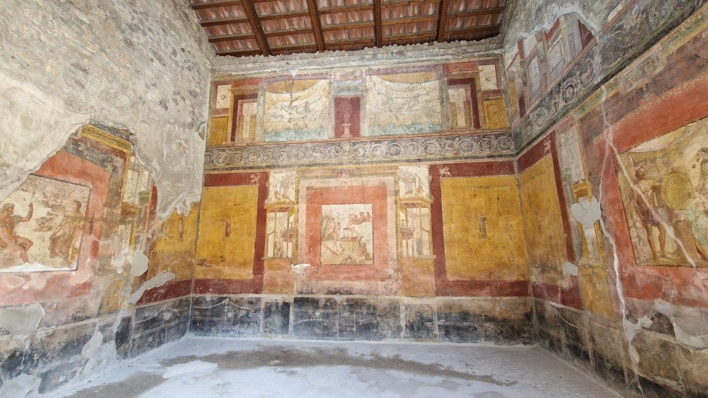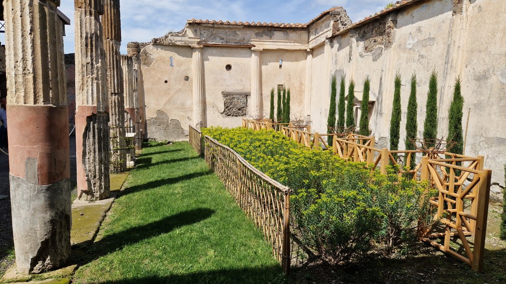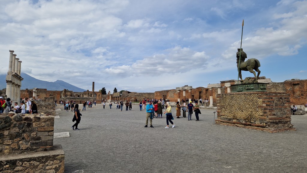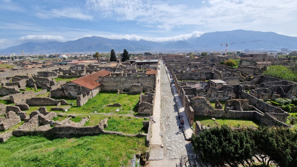 Frühmorgens am nächsten Tag standen wir vor den Toren der archäologischen Stätte von Pompei. Die archäologische Stätte erstreckt sich über knapp 100 Hektaren und ein Viertel sei noch immer nicht ausgegraben. Mehr als 1500 Jahre lang lag die Stadt unter einer rund 25 Meter dicken Asche- und Bimsschicht, bevor Ausgrabungen gestartet wurden. Wir verbrachten einen ganzen Tag in der Stätte und waren tief beeindruckt davon. Die Stadt wurde durch die Asche gut konserviert und zeigt ein eindrückliches Bild der Wohn- wie auch Geschäftsgebäude. An diversen Ecken sind antike „Take-aways“ vorhanden. Verkaufstresen aus Stein mit Einlassungen für Tontöpfe, bei denen warmes Essen verkauft wurden. Bei der Markthalle kann ein Eichtisch für Hohlmasse aus Stein begutachtet werden und in den Wohnhäusern sind die Wandfresken oder die wunderschönen Mosaike teilweise noch komplett erhalten. Besonders eindrücklich geben, die mit Gips ausgefüllten Hohlräume der Opfer, die Tragödie, die sich an diesem Ort ereignet hatte, wieder.