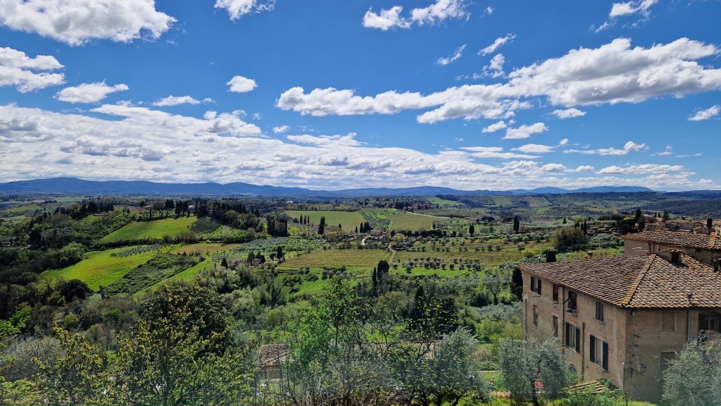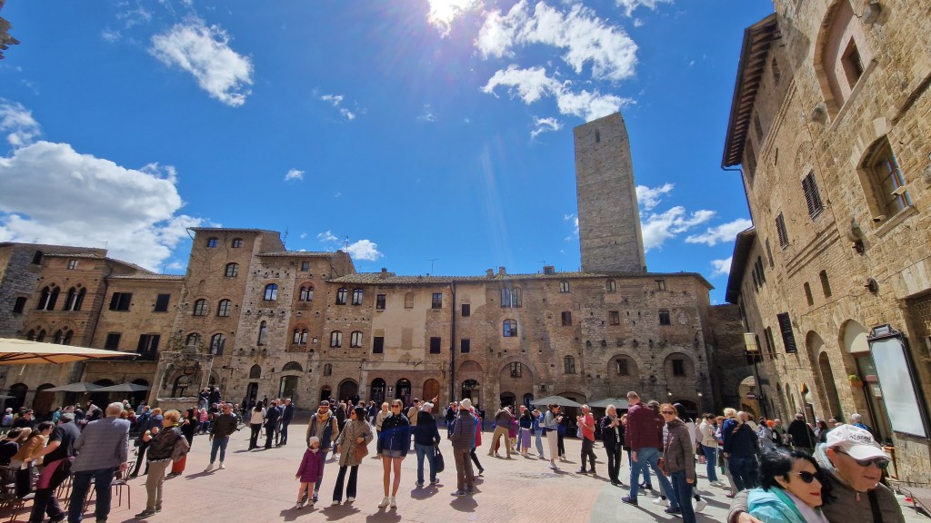 Auf dem Weg von Siena nach San Gimignano durchfuhren wir die wunderschöne toskanischen Landschaft. Sanfte Hügel mit toskanischen Zedern zogen an uns vorbei. Als wir im mittelalterlichen Manhatten, wie San Gimignano aufgrund seiner Vielzahl an Geschlechtertürmen auch genannt wird, ankamen, suchten wir uns etwas ausserhalb einen Parkplatz für den Frosch. Wir schlenderten durch den kleinen Ort, dessen Stadtkern auch UNESCO Welterbe ist. Mit den Geschlechtertürmen versuchten sich im Mittelalter die verschiedenen Familien gegenseitig in der Höhe zu übertreffen. Aktuell existieren in San Gimignano von den ursprünglich 75 Türmen noch deren 15.